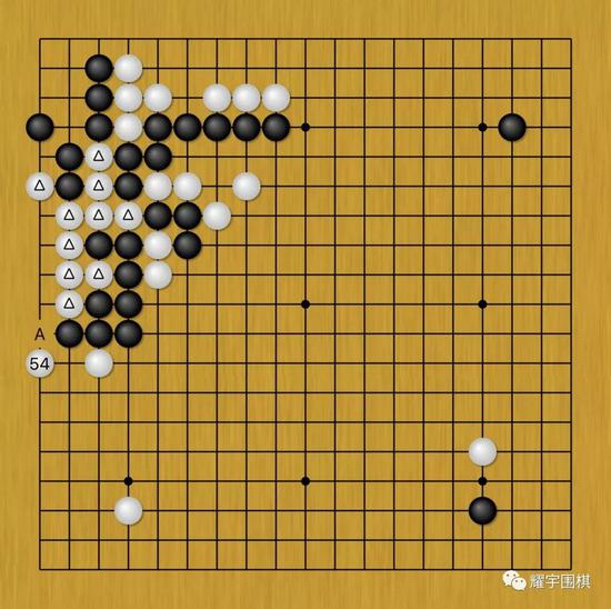 白54这步棋虽然是放在了效率极低的一路,但它的表面意图很明显,那就是黑棋若不走的话,白棋下一手可以A位渡过救回白三角十子。