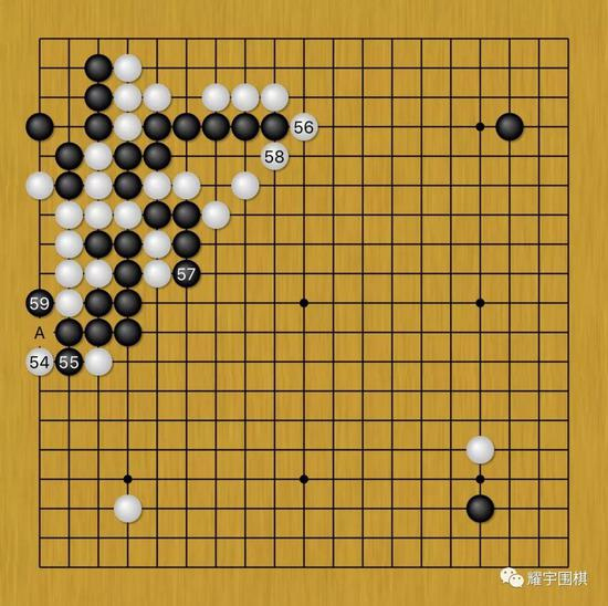 难怪在白54未下前,柯洁还有11%的胜率,等下到黑59扳的时候,柯洁只有3%的胜率了。。。。。。