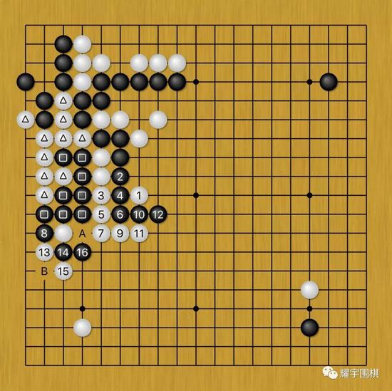 白13扳住,看着似乎要堵住黑棋了,但遗憾的是,黑14打完后黑16单长是好手。接下来A、B两点各得其一,白棋功亏一篑。