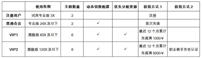 用户使用前需要先进行注册,登录后可领取10元试用金,测试专业版3X一小时。根据后续充值金额或棋手实名认证,用户可升级权限,享受更高的服务。