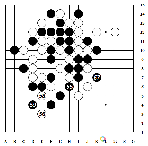 54堵死了黑棋竖线眠三,自己形成新的活二不但完美牵制黑棋斜线眠三和活二,而且在H6和L8都有做VCF杀的机会。经此一手局面出现巨大转折,李小青也是惊讶不已,盯着自己的左下角看了好一会,始终没能算到杀死白棋的机会。无奈只得先防守白棋两个强势做杀点位。