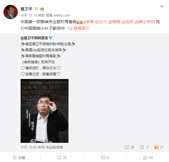 11月14日下午,棋圣聂卫平在个人微博上转发首部围棋题材青春剧《舍我棋谁》即将开拍的内容,从官方发布的消息,将出任该剧的艺术指导并特邀出演。