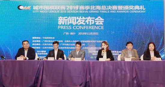 11月20日下午,城围联2019赛季北海总决赛暨颁奖典礼新闻发布会在南宁市南国弈园举行。北海市委常委、宣传部长、副市长黄江,城市围棋联盟副理事长、广西体育局原巡视员岑汉康,广西体育局青少年处二级调研员蓝桂明,北海市旅游文体局党组书记张实,华智城围联体育产业股份公司总经理覃洪兵,广西围棋协会常务副主席、北海围棋协会会长林如海,以及广西和北海市各大媒体、中央驻桂媒体记者,赞助商和合作伙伴代表60多人出席了当天的新闻发布会。发布会由华智城围联体育产业股份公司总经理助理张行涛主持。