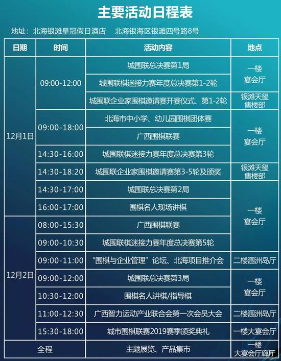 定了!城市围棋联赛2019赛季北海总决赛暨颁奖典礼将于12月1日、2日在北海银滩皇冠假日酒店举行。北海弈海清风围棋俱乐部第二次向赛季冠军发起冲击、近百名全国各地企业家出席是本次活动的两大亮点。