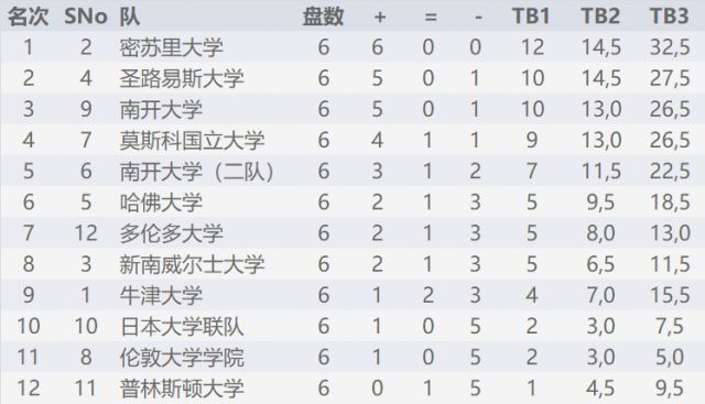 昨天排名前两位的密苏里大学和圣路易斯大学在第五轮时对冲,结果凭借两位男棋手的胜利,密苏里大学以2比1的成绩笑到了最后。