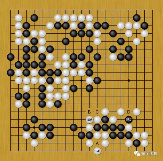 而此时井山黑167单打吃,是冷静的胜招。杨鼎新应该是忽略了这步棋,对此白168无奈只好自补一手,白168很想在D位粘上,但是: