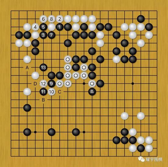 图7:接图6。黑1、3、5、7是愉快的先手,然后黑9、黑11拐了扳很严厉。黑13小尖后,接下来白若B位吃黑11一子,黑C位可断开白圆圈九子,由于周围全是黑棋的子力,白圆圈九子凶多吉少。白若不在B位抱吃,外围也不好走,而黑左边还随时有A位靠下的手段。