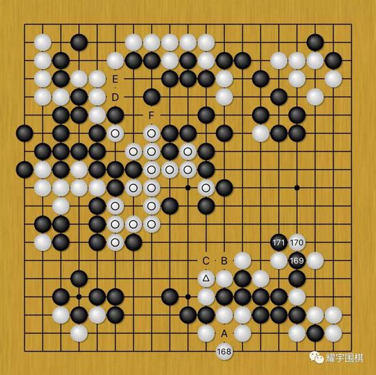 图17:当白168需要自补一手时,黑169、171冲断后,白外围包围圈由于有个B位的致命断点,外加白中央圆圈大龙随时要被黑D、白E、黑F切断归路,已经无法收场了。