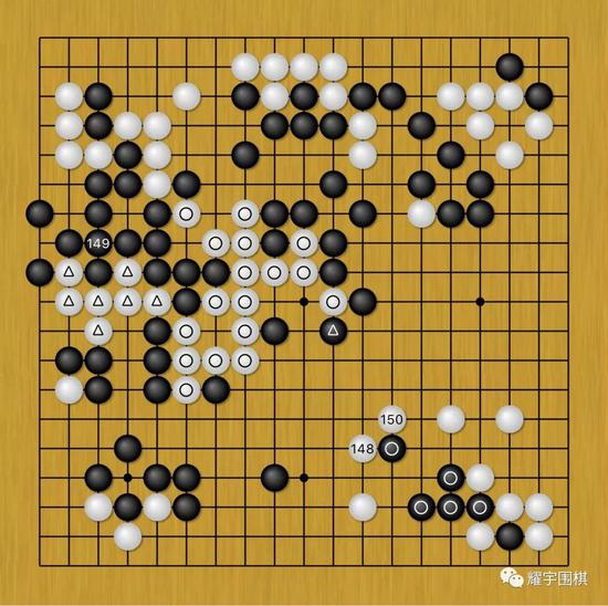 图11:这是左边对杀劫争进行了数回合后的局面,白150后,劫争告一段落,杨鼎新输掉了左边的劫争,换来了将黑右下圆圈五子包围进去的利益。