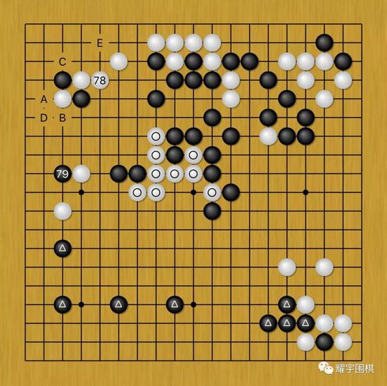 图8:杨鼎新选择了白78长,给黑棋留下活角的余地(黑A、白B、黑C、白D、黑E可活角),毕竟此时作为白棋来说,照应中央白圆圈九子才是当务之际,至于左上角的损失,白只要能抢到先手,可以通过掏黑下方三角阵势给弥补回来。