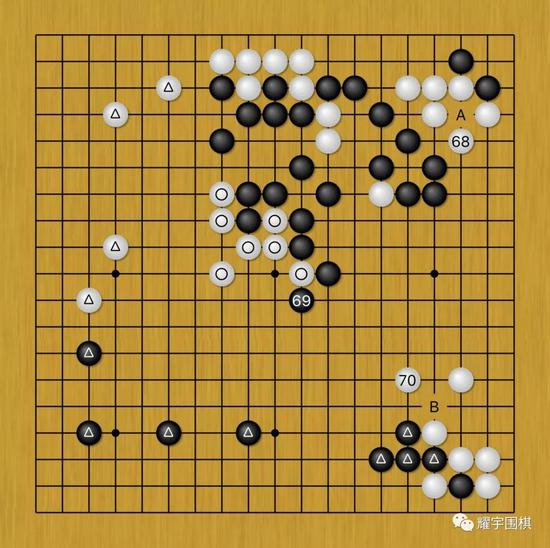 那么既然白68抢了右上眼见的实惠,井山黑69必然要拍过来占据中央制高点。黑69后,顿时与黑下方三角阵势有了呼应,对此白70必须花手棋限制住黑下方阵势的发展,不然再让黑棋在B位打吃着扩张,黑下方阵势将更为立体化。