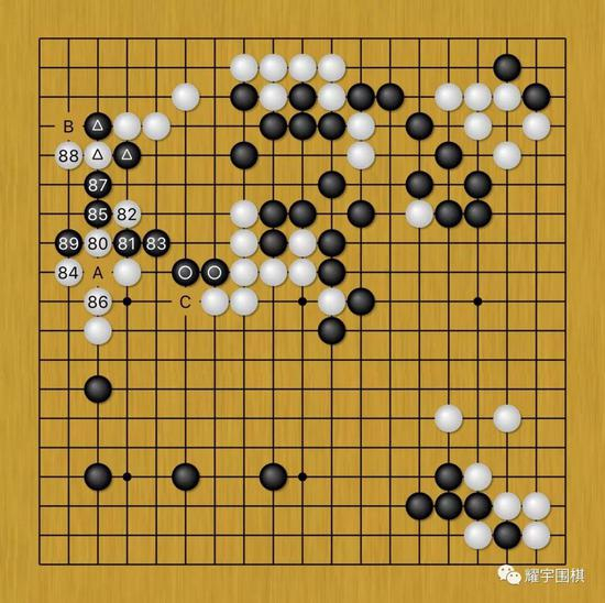 黑89后,虽然黑棋整块棋没看出怎么活,但是白棋接下来肯定要花手棋防黑B位挡下的手段,那么黑C位拐出分断白棋后,双方将围绕着A位的劫争,展开一场激烈的对杀。