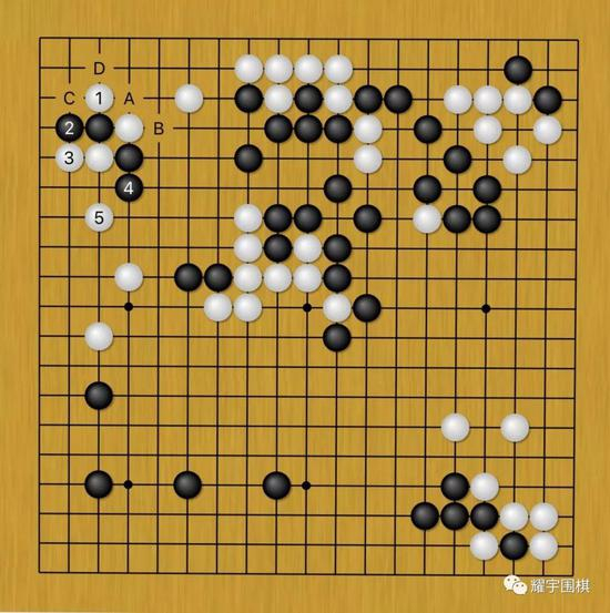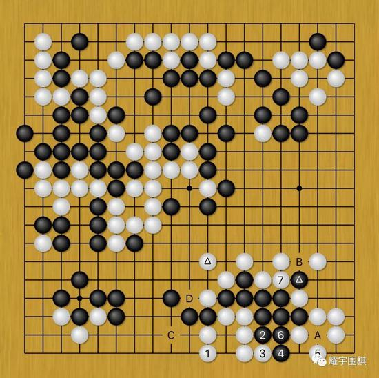 图6:面对黑棋靠了断,白1、3打了一挡是局部最佳应对,黑4长的话,白5还能跳出,之后角上黑若A,白B、黑C、白D。黑无功而返。