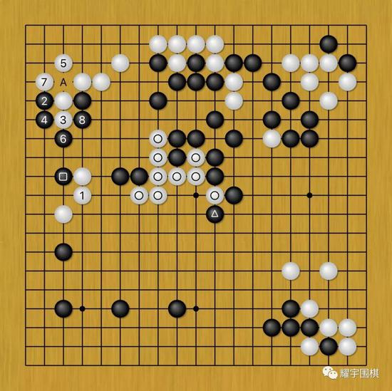 图9:从事后来看,面对井山黑79(黑方块一子)托的时候,杨鼎新可能只能白1退忍耐了。但这样的话,黑2以下就不会满足于活角,而是直接将根据地搭到边上去。