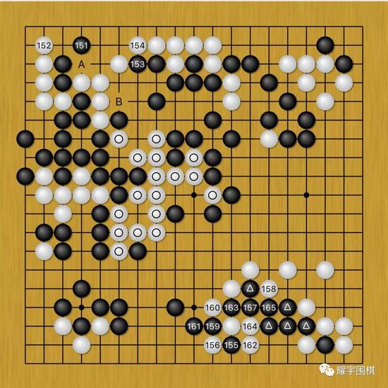 图12:井山先是黑151、153跑到左上打了两将,这两将打的很损。因为黑棋原本在左上正确的行棋次序是应该先黑153顶,待白154位挡住后(白154不挡下立的话,先亏两目以上),黑再A位拐,对此白棋也得白152位应,这样黑B位贴是先手。一旦B位贴是先手,白中央圆圈大龙就被黑棋先手切断归路,黑右下稍微有点借用,即可杀白大龙。