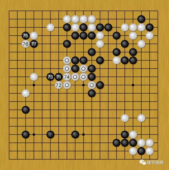图5:井山先是黑71、73与白交换两下,把白棋中央圆圈七子走的再重些(以后再走,白74就很可能不粘了)。然后跑到白左上角祭出了黑75、77这两步非常规手段。