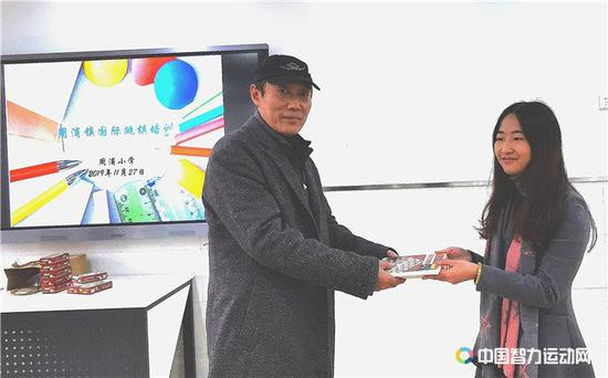 王彦代表大师赛组委会向学校赠送国跳棋具和入门书籍