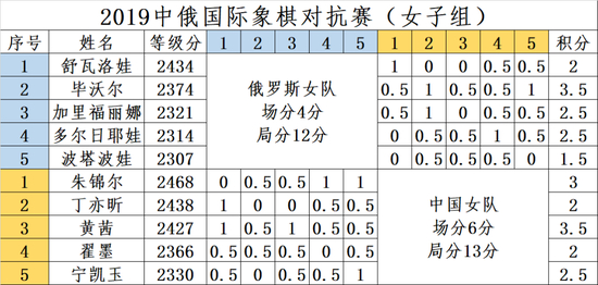 这样,五轮比赛中,中国女队以一胜四平,场分6比4,局分13比12,赢得女子组对抗赛优胜。个人成绩方面,中国队黄茜和俄罗斯队毕沃尔同为2胜3和积3.5分,成绩最好。
