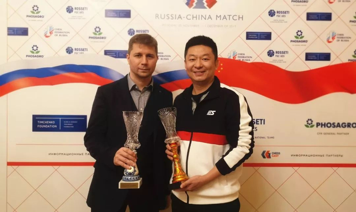 主裁判波斯托夫斯基宣布比赛结果,俄罗斯棋协主席菲拉托夫向俄罗斯男队和中国女队颁发了优胜奖杯。