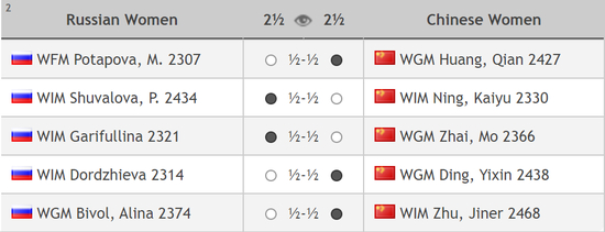 女子组比赛五盘棋悉数弈和。中俄两队旗鼓相当,第四次打成平手。