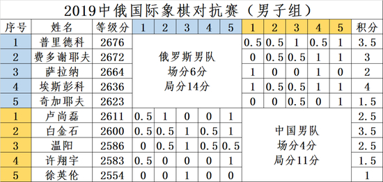 俄罗斯男队在五轮比赛中,取得三胜两负,以场分6比4,局分14比11获得男子组对抗赛优胜。俄罗斯队埃斯彭科3胜2和积4分,是全场成绩最好的棋手。中国男队得分最高的是白金石,2胜3和积3.5分。