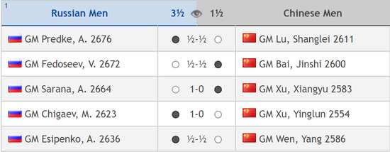 总成绩方面,俄罗斯队以总局分26比24领先于中国队。