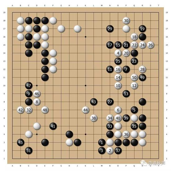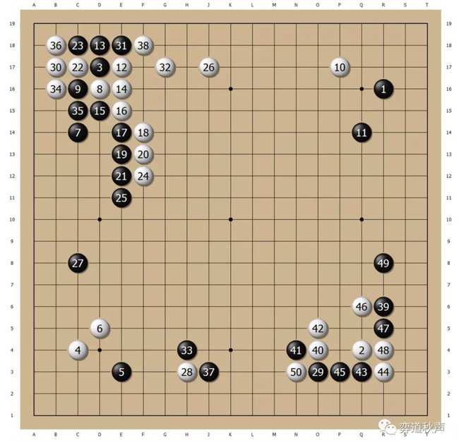 黑13以下的局部定型非常普通,按理说黑棋没有不好的道理,但到白26拆边,已经成为白棋开阔的局面。这究竟是分先情形下黑棋的“先天劣势”,还是人类对围棋的理解不足,一时还难以判断。