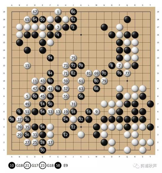 白41、43选择了早期的芈氏飞刀定式,白47扳后,白49夹,这是现在AI推荐的手法,是不是复杂的芈氏飞刀已经可以避开了呢?