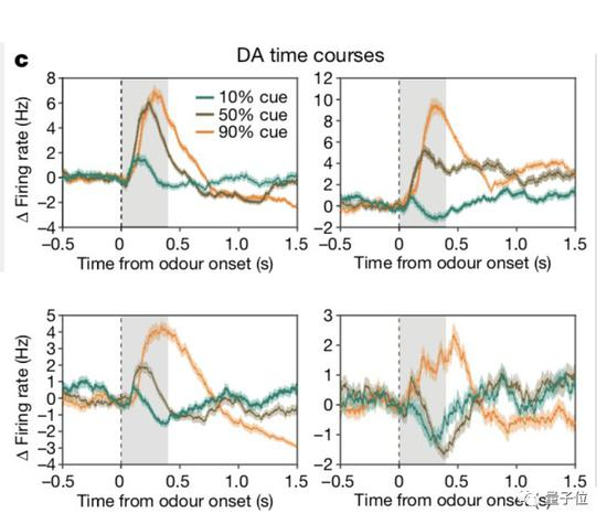 分别是10%、50%、90%的奖赏概率,并同时记录了四个多巴胺神经元的反应。