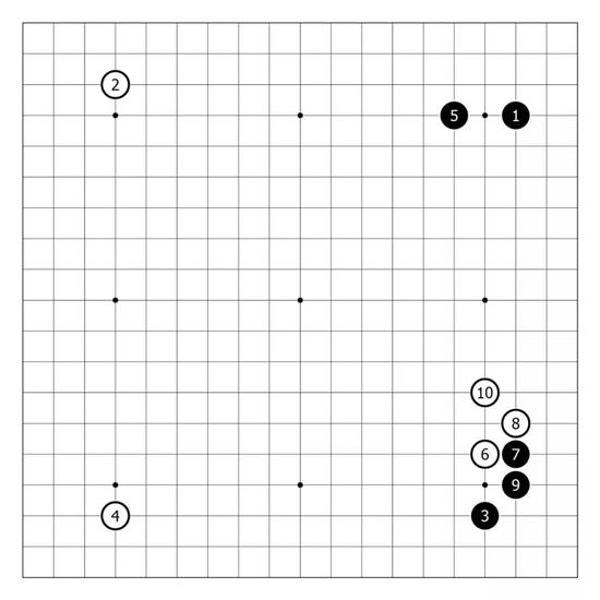 话说回来,白在左上方尖出之时,黑可以直接从左边拆边,这样黑棋较为从容,也是AI的推荐应对。