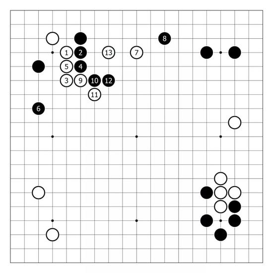 白7打入上方,有左边数子映衬,黑3子顷刻便突显出薄味来。黑8紧逼气势对冲,这样白棋得以拐头,白11扳黑12长之后,白13点正中黑形要点。