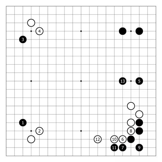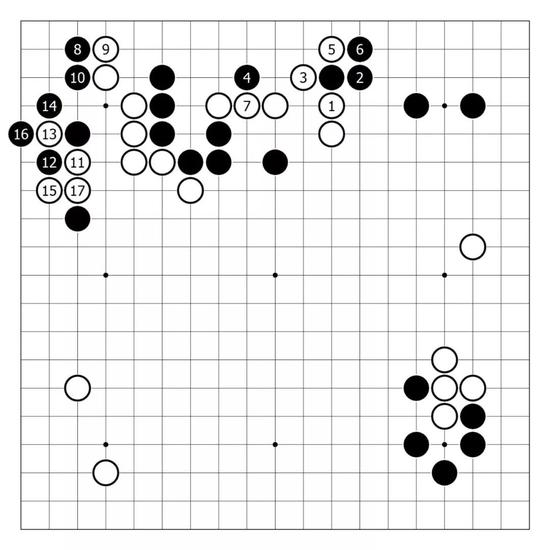 之后白如靠下,黑应对颇为简单,即从7位扳下,白8挤黑9虎之后,白10长再跳出,黑角部已定型完毕,再从13位跳出,构成立体形状,以后还保留挖出的手段。