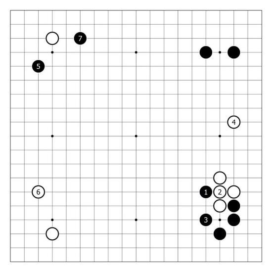 AI认为,黑可于左边先1、3位挂入交换,再从边上逼住白棋。托退定式,白虎与粘相比较,弹性更足不易被攻,但也给对手留下脱下而在边上逼住的机会。