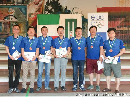 重返亚太冠军的宝座,给了2017国家队极大的信心。6月7日韩国比赛刚结束,没休息几天就转战到了意大利的蒙特卡蒂尼参加欧洲桥牌公开赛的比赛,欧洲公开赛是欧洲桥联于2003年设立的公开性赛事,2013年中国女队曾经获得此项比赛女子团体赛的冠军,中国男队还是第一次参加此项比赛。在120个队的公开团体赛预赛中,中国队幸运地以第16名拿到了最后一个淘汰赛的席位,淘汰赛第一轮战胜挪威的Heimdal队,第二轮与立陶宛的东欧军团ERA队战平,经过加时赛淘汰对手进入四强。半决赛的对手是本次比赛发挥出色淘汰了多支强队的希腊队,中国队没有把握住机会负于对手,但由于本次比赛不设立附加赛,因此中国男队并列第三名获得了欧洲公开赛公开团体赛的季军。登上了世界大赛的领奖台。