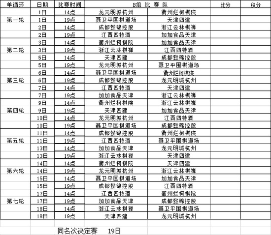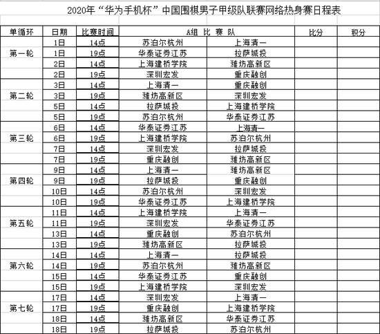 2020年“华为手机杯”中国围棋男子甲级队联赛网络热身赛日程表