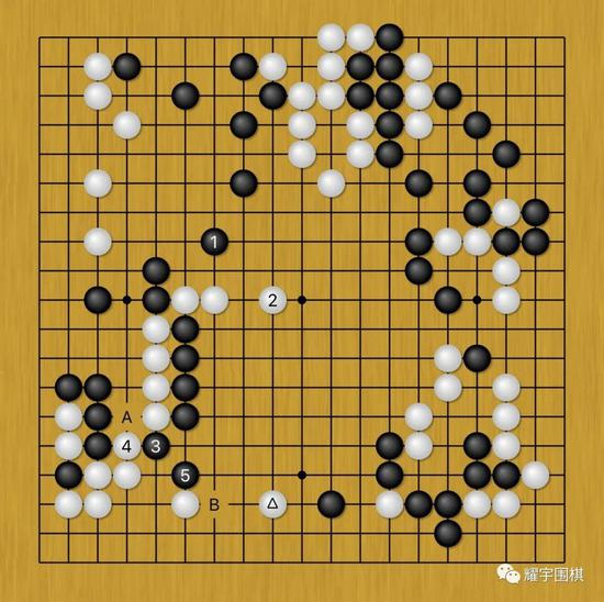 图6:黑1飞的时候,假设白2跳一个,那么左下黑3、5扳了一虎后,白棋若防A位的断点,黑B位扳下后,原本与世无争的白三角一子也被分断加入了战团。