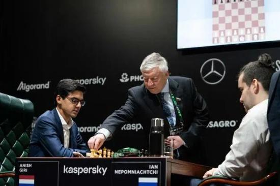 开棋环节上,前世界棋王卡尔波夫走到棋桌前,为俄罗斯棋手涅波姆尼亚奇与荷兰棋手吉里的比赛开棋。按照惯例,他随后应该跟两位棋手握手致意。然而,伸出的手停在半空,没有得到任何回应——这是意料之中的拒绝。