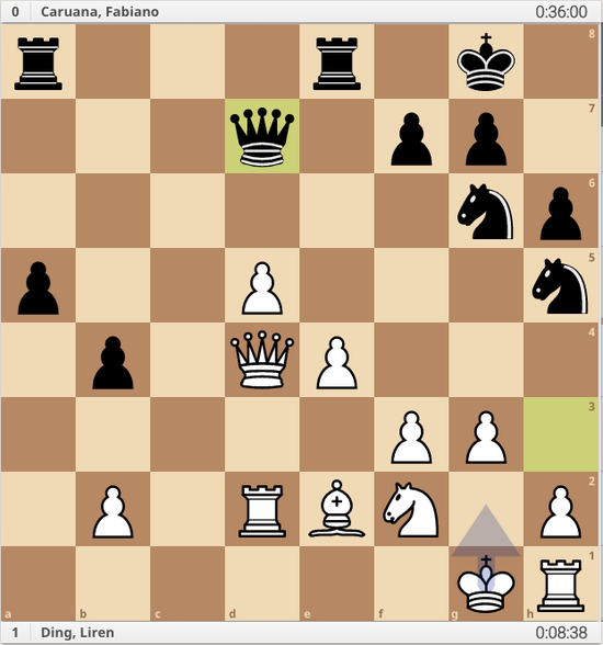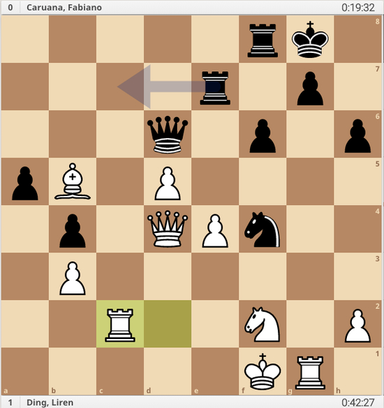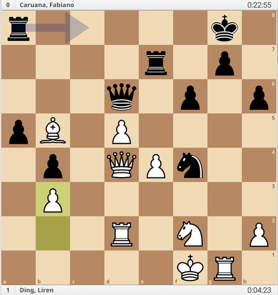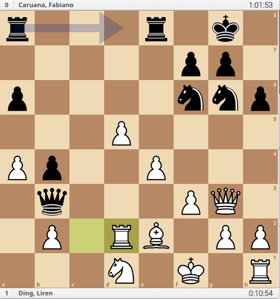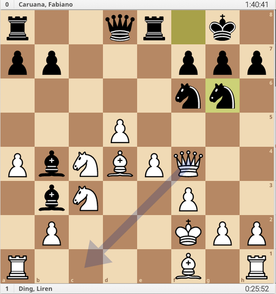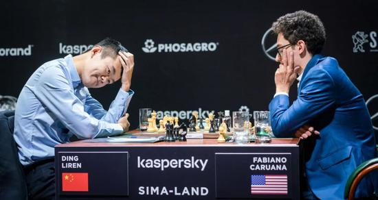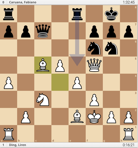 在Qc5和Re5的取舍中,卡鲁阿纳计算了14分钟(1:32-1:18)。这应该让丁立人彻底放心了,虽然局面上依然复杂,但至少脱离了对手的准备,双方可以在同一起跑线上战斗了!