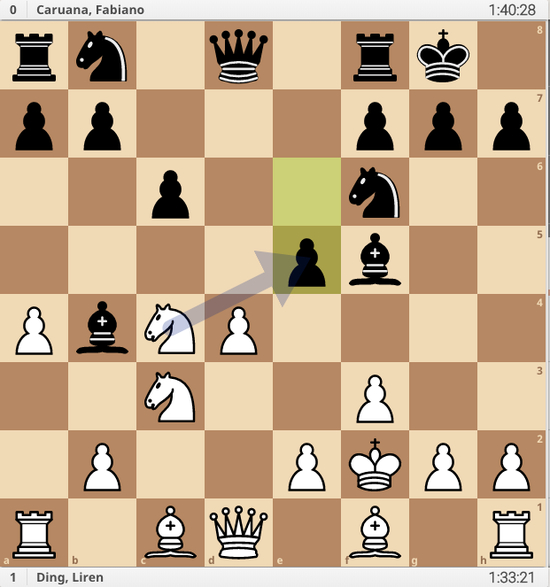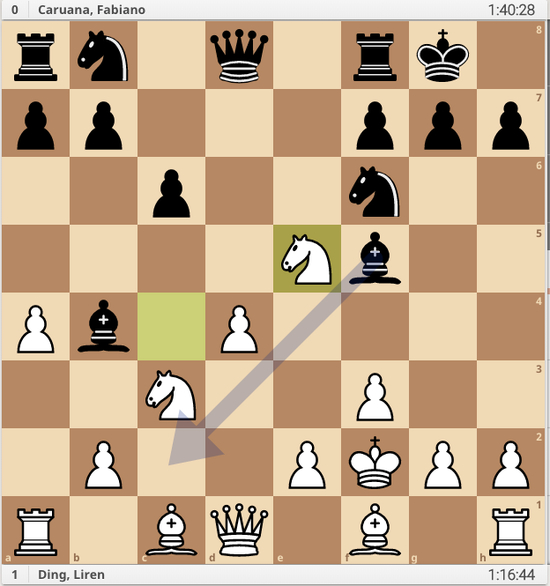 丁立人花了17分钟(1:33-1:16)走出了Nxe5。在这十七分钟里,他恐怕花了两分钟搜索记忆,确认这一步e5确实是卡鲁阿纳的开局礼物,然后再调整心态,尽量不受到前两盘状态不佳的影响。不管他的心理建设准备了多久,他肯定是明白卡鲁阿纳绝对不是混和棋来的。