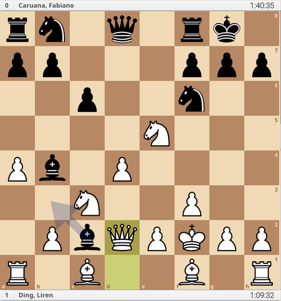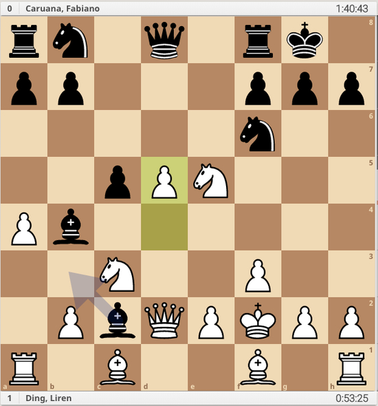 此后的15分钟,丁立人应该草草看了dxe5的变化,感觉这个棋意思不大。然后花了几分钟思考了一下e4反冲击的可能性,在黑方exd4 Na2之后发现黑方有Bc5这样弃子的下法。估计一时看不清楚,又结合了卡鲁阿纳“有备而来”的状态,放弃了这个复杂的变化。