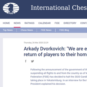 3月27日,俄罗斯联邦政府宣布暂停所有国际航班后,国际象棋联合会(FIDE)决定暂停正在叶卡捷琳堡举行的2020年国际象棋候选人锦标赛。在接受俄罗斯塔斯社采访时,国际棋联主席解释了这一决定。