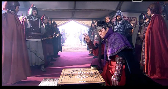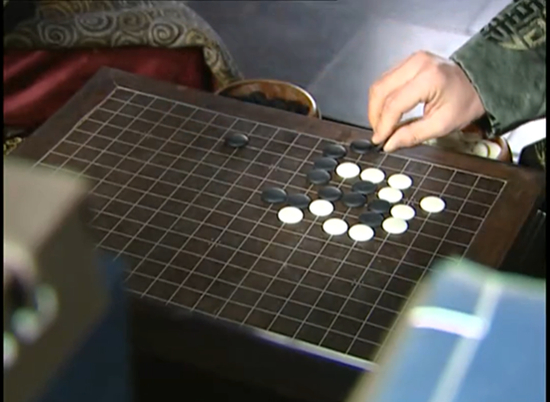 在决心诱擒韩信之前,吕后问计张良。有趣的是,客串扮演张良的正是该剧导演周晓文,同样是著名围棋爱好者的周晓文仅出场这一回,借围棋死活题为吕后出谋划策,当时的新闻报道中说他“既过了戏瘾又过了棋瘾”。随后有了下面一幕。