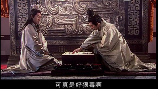 魏冉继任者范雎(右,孙维民饰)与郑安平对弈,当只展现远景,镜头远离棋盘时,着实古色古香,与时代背景甚是贴切。