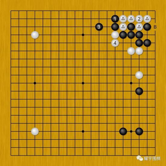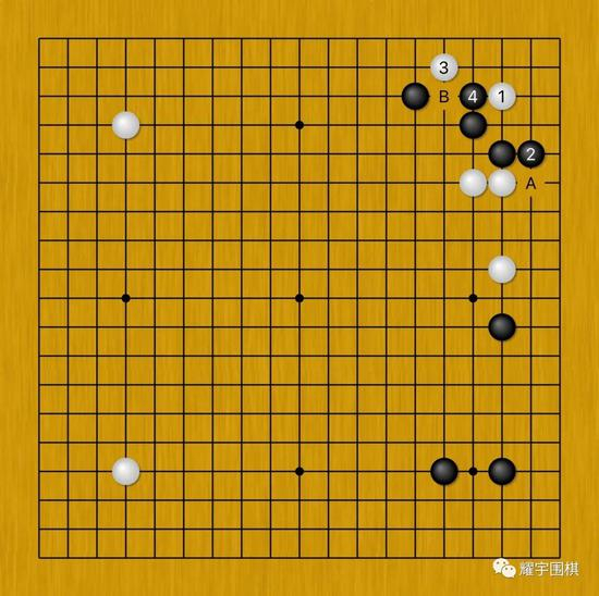 图4:既然在A位单纯活角不满意,白棋就想追求更好的结果。因此白1、3冲断的手法就登上了舞台。