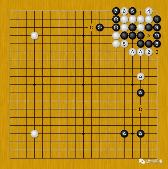3:从全局来看,白棋先手在握可优先挑选好点,而反观黑棋右下三角阵势,不仅发展潜力全无,还留有被白棋D位打入的严厉手段。