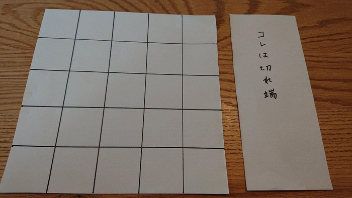 《一天一条推特介绍围棋规则,要花多少天能讲完——第二天》。看到很多人说,家里不可能有棋盘,所以我们就从制作棋盘开始着手。把A4纸剪成正方形,像照片一样地划线。加上边上的线,这样就做成了一个6路棋盘,这个棋盘经常在说明规则的时候用到。棋子的话,就拿路上的石头就行了。
