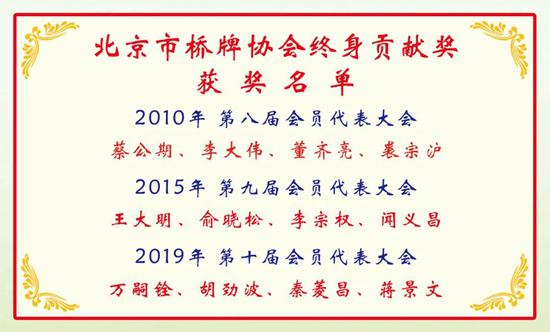 2019年 北京市桥牌协会为万嗣铨、胡劲波、秦菱昌、蒋景文颁发终身贡献奖