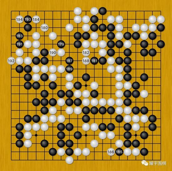 图10:马晓春从黑179开始,在白空里各种辗转腾挪,虽然马晓春是腾挪的高手,但是由于此地空间过于狭小,因此很难有所作为。