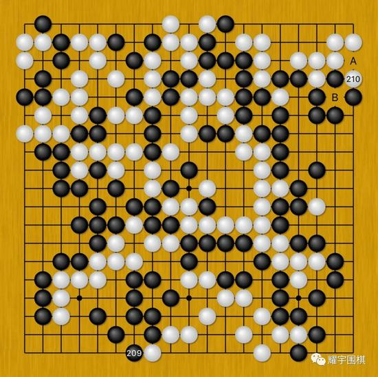 但是聂卫平却得理不饶人,白210右上提劫,意图逼迫黑棋在B位粘上。