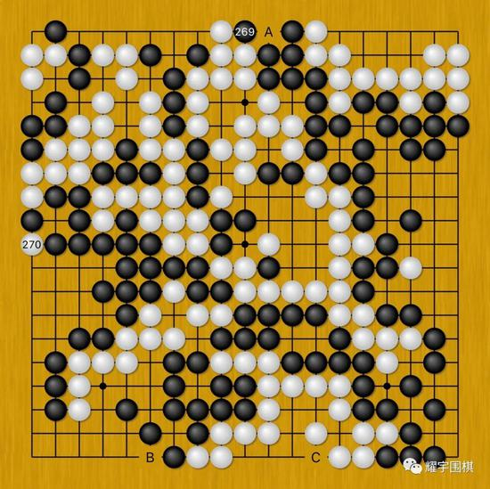 图14:最后的小官子收完后,必然会出现黑269这个单劫,但是黑269提劫后,全盘白棋有270、B位两枚劫材;而黑棋则仅有C位一枚劫材(左上居然一枚劫材都没了)。